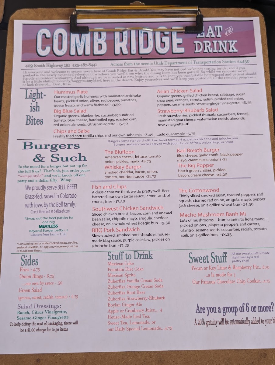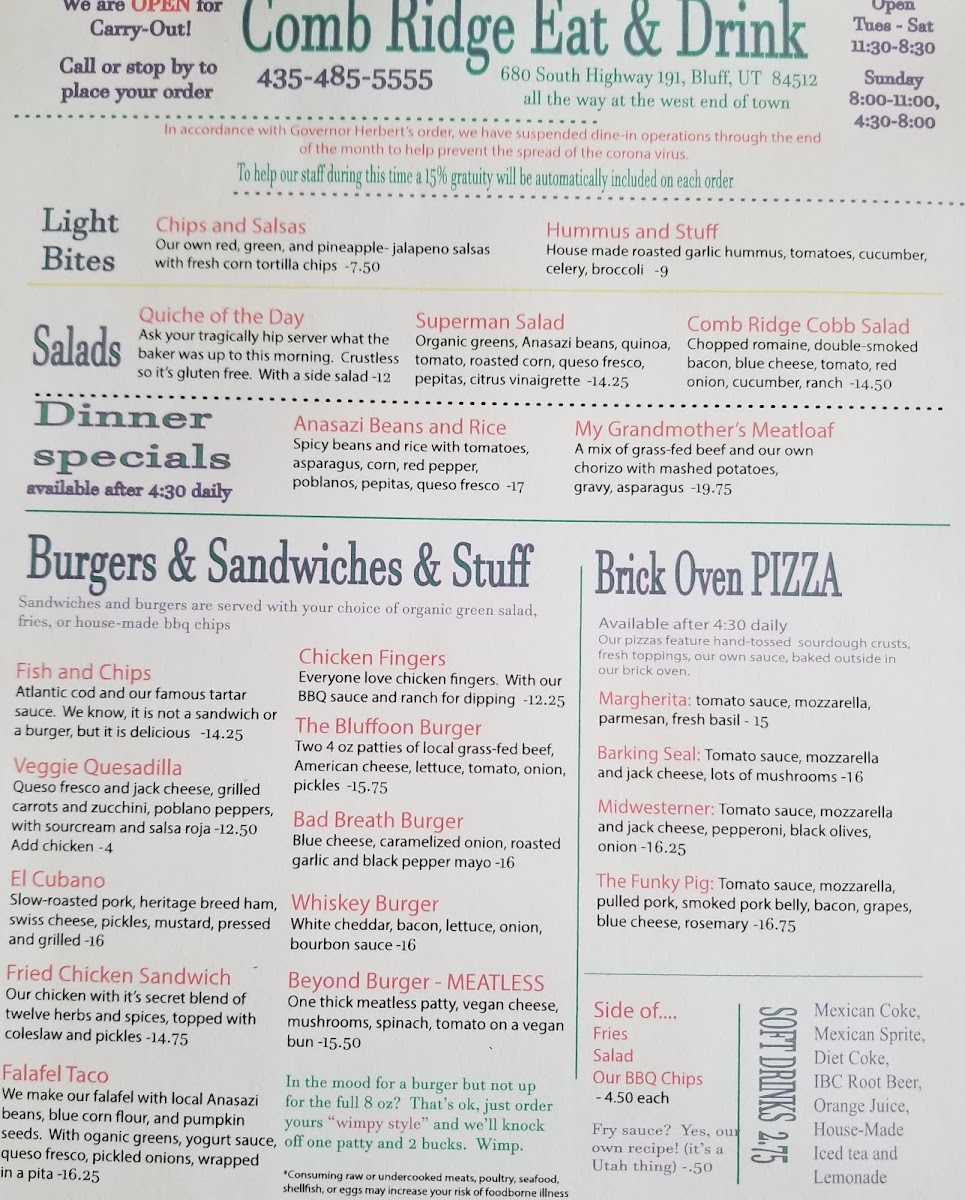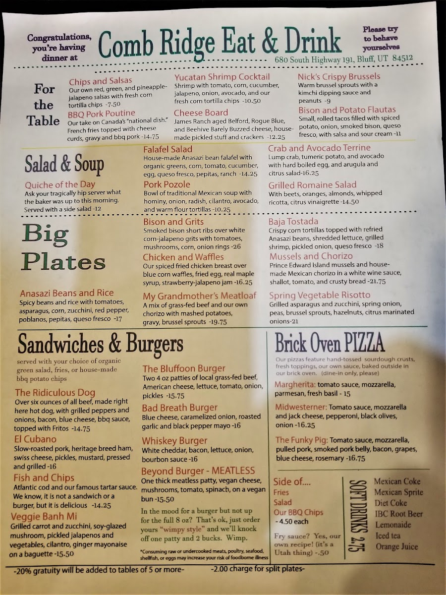 Comb Ridge Eat and Drink Menu (2025 Update)